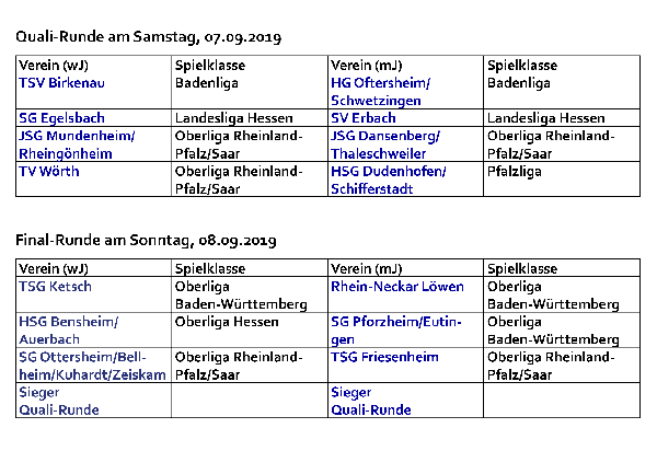 Das Finale der weiblichen Jugend beginnt um 18:00 Uhr, um 18:40 Uhr steigt das Finale der B-Junioren. Anschließend findet die Siegerehrung statt.